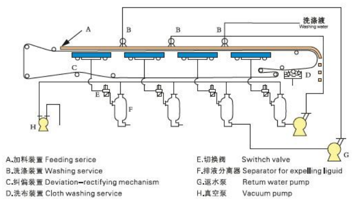 橡膠帶式真空過濾機是一種以真空負壓為推動力實現固液分離的設備。真空負壓(0.04-0.07MPa)的作用下,懸浮液中的液體透過過濾介質(濾布)被抽走,而固體顆粒則被介質所截留,從而實現液體和固體的分離。其在結構上過濾區段沿水平長度方向布置,可以連續完成過濾、洗滌、吸干、濾布再生等作業。